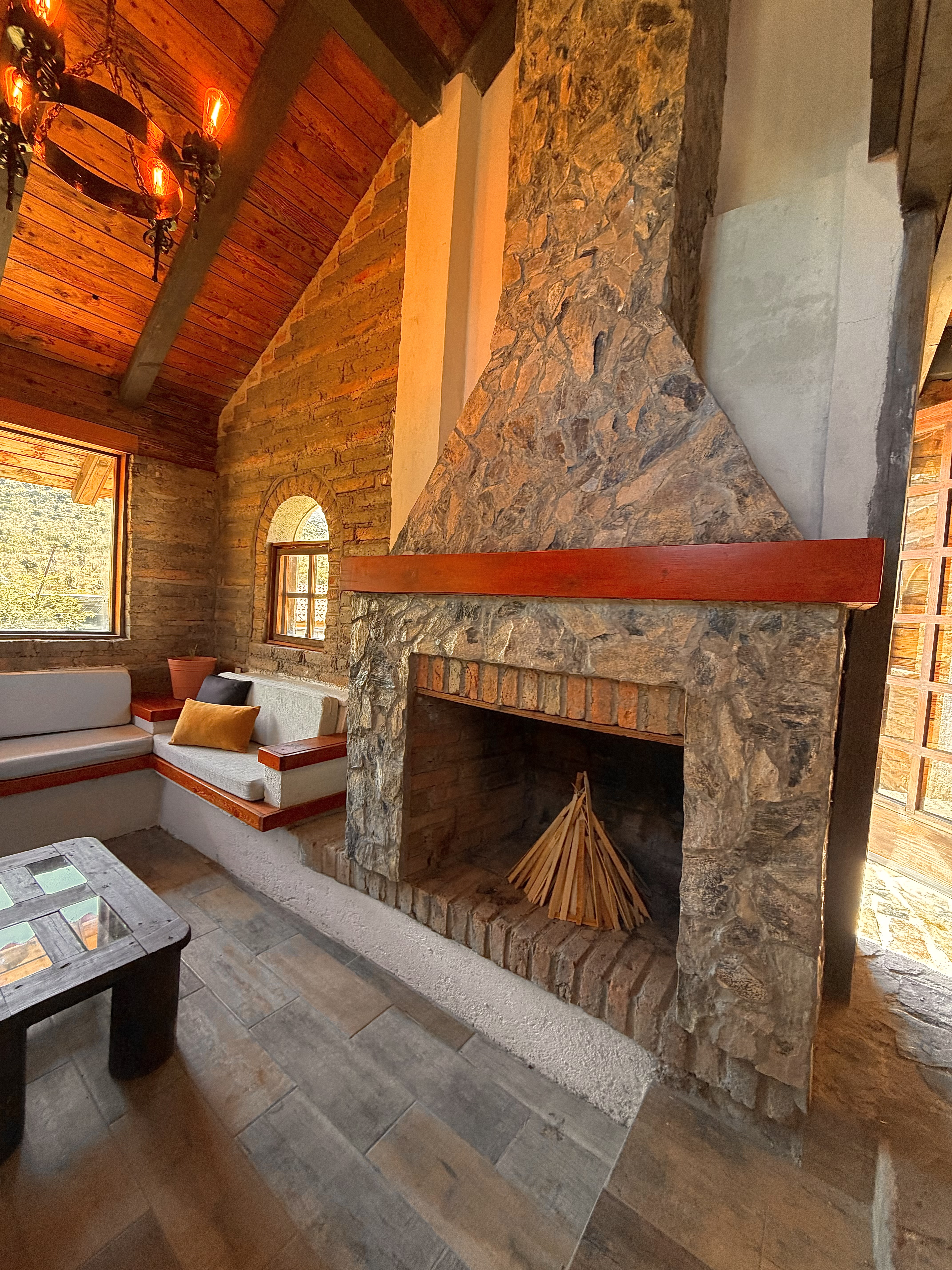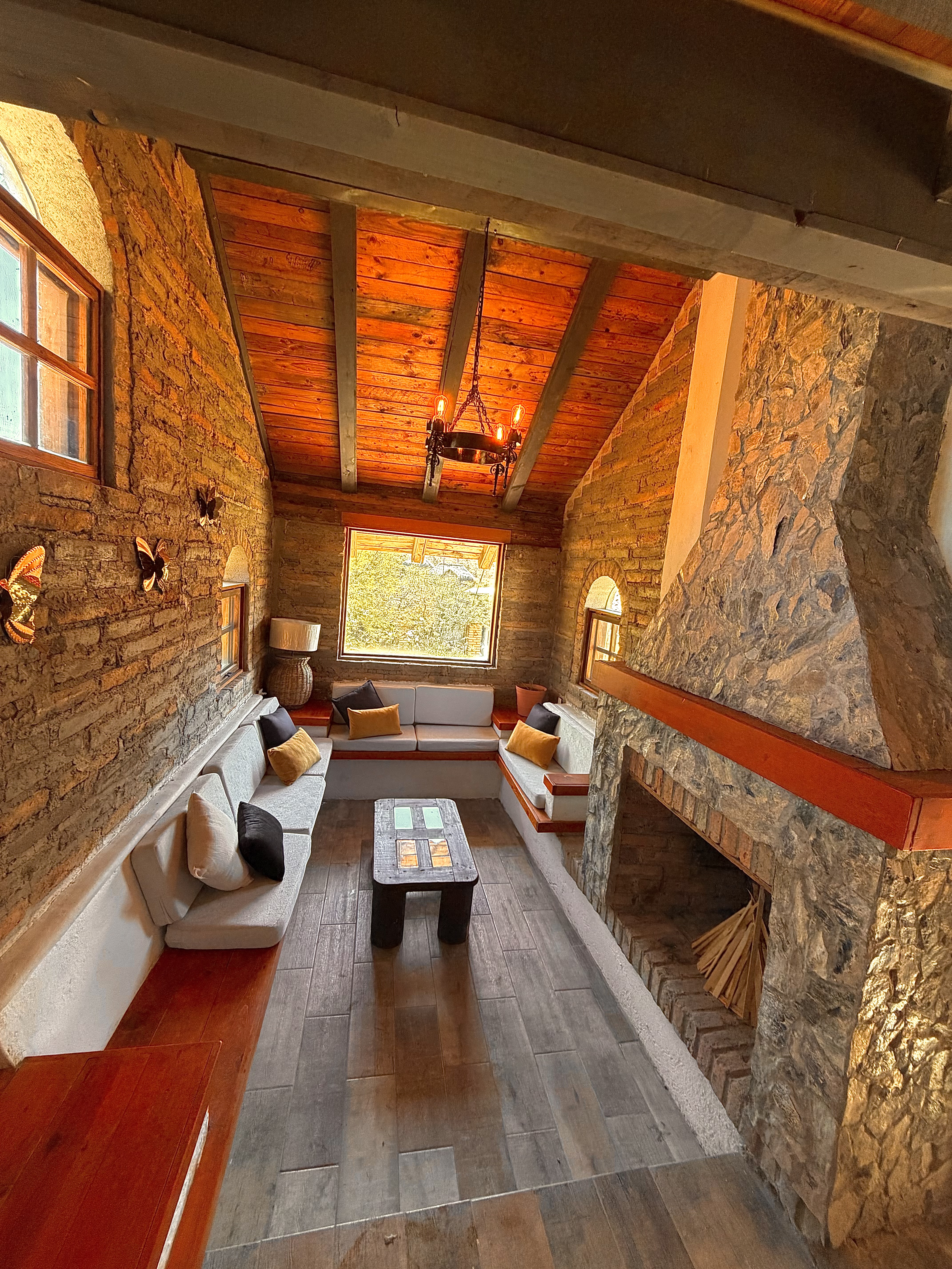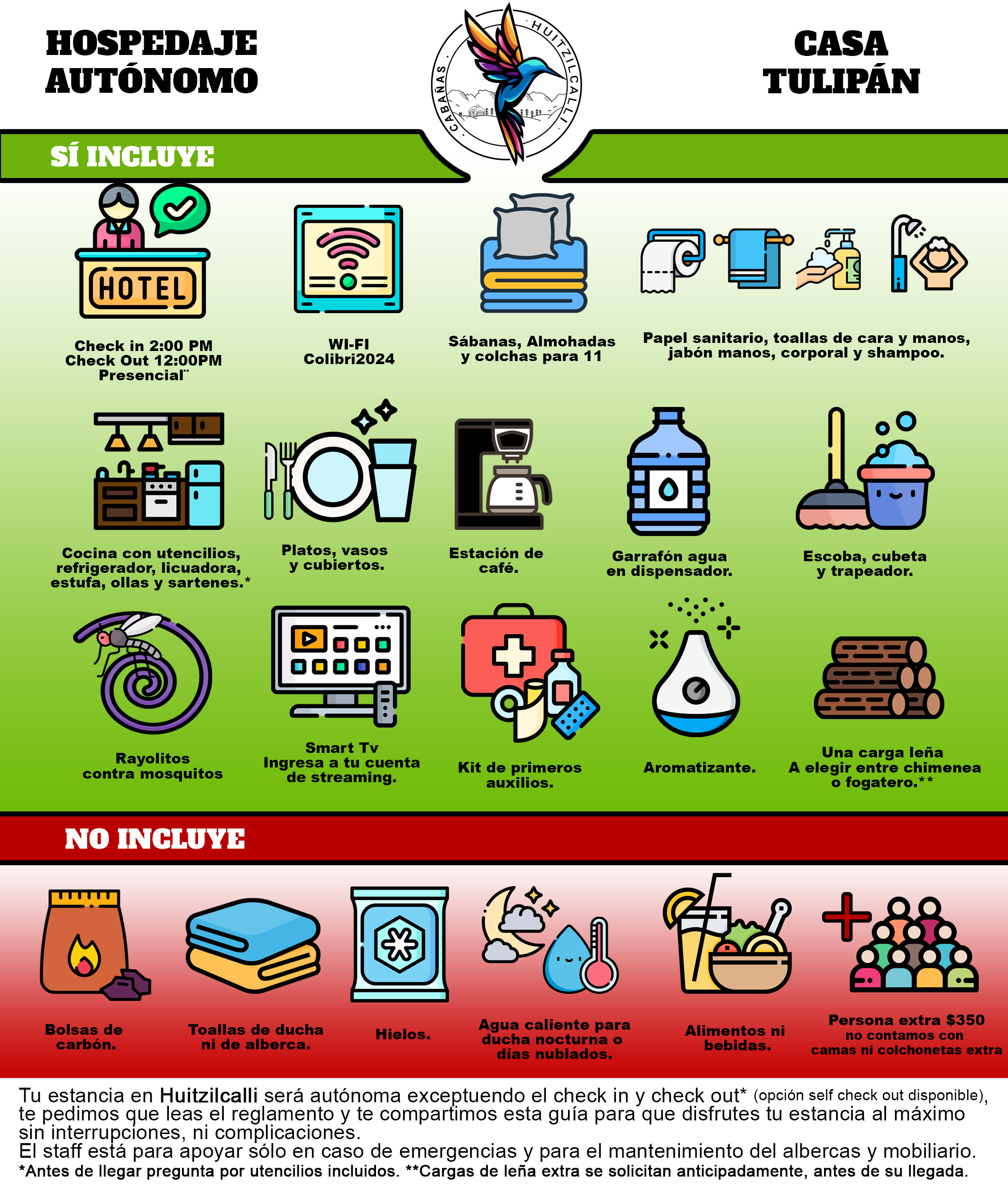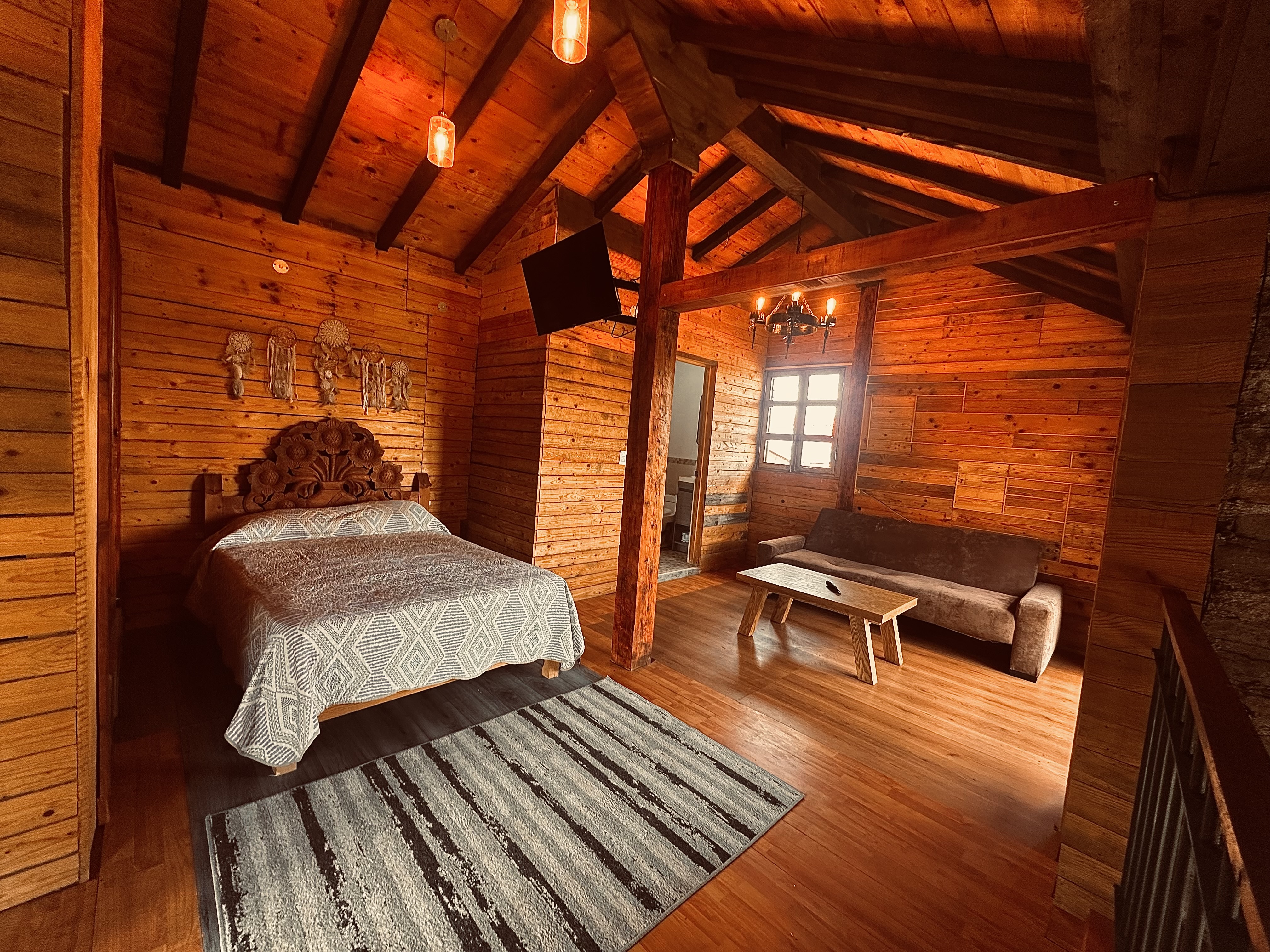 CABAÑA PARA 11 PERSONAS. Sala, Comedor, Cocina y 2 baños completos. Alberca Privada. Chimenea y Fogatero con una carga de leña incluida a elegir. Habitación 1: En planta baja. Literas con 2 camas matrimoniales abajo y 2 camas individuales arriba. Habitación 2: 1 Cama Matrimonial. Habitación 3: Cama matrimonial y sofá cama matrimonial. Acceso a área común de alberca, jacuzzi, chapoteadero, palapas y juegos infantiles. (Pregunta por el costo de cargas de leña extra.)